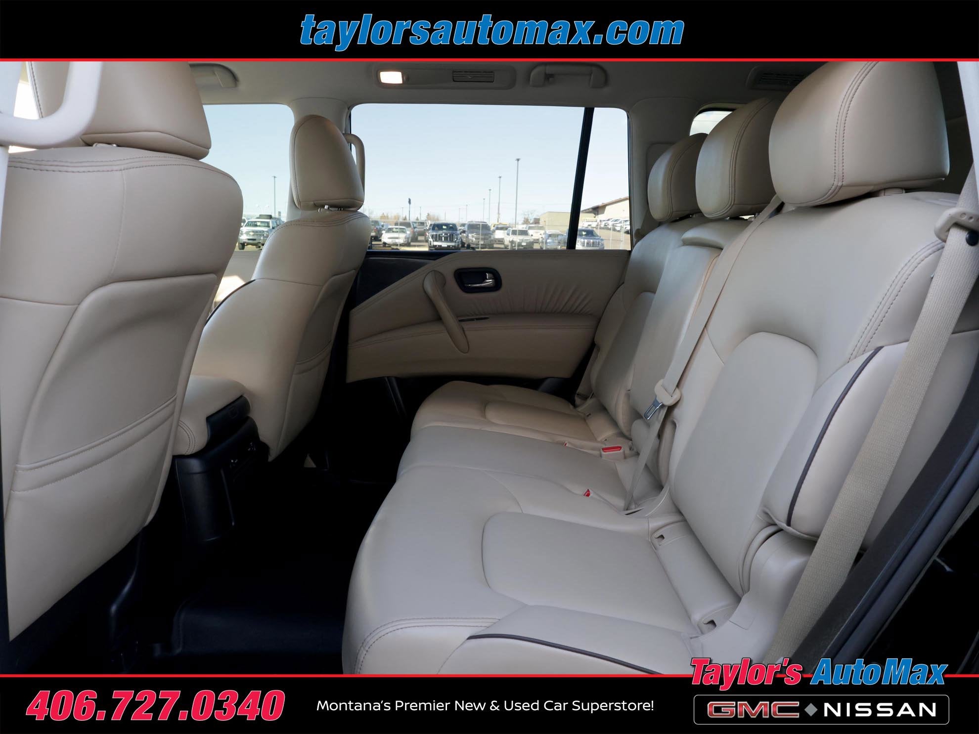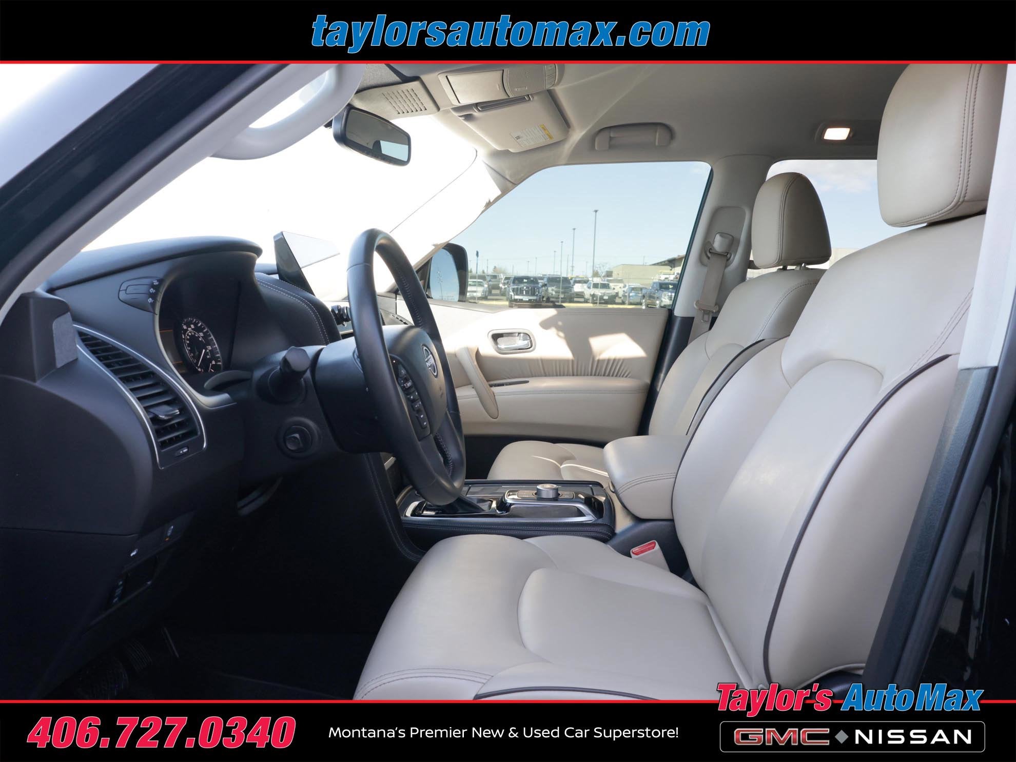 LOCAL TRADE IN, LEATHER INTERIOR, Armada SV, 4D Sport Utility, 5.6L V8 DOHC 32V LEV3-ULEV125 400hp, 7-Speed Automatic, 4WD, Super Black, Almond w/Leather Seat Trim, 20 Aluminum Alloy Wheels, 20 Wheels, 4-Wheel Disc Brakes, 6 Speakers, Air Conditioning, Auto-Dimming Interior Rear-View Mirror, Automatic temperature control, Front dual zone A/C, Front Fog Lights, Heated front seats, Leatherette Seat Trim, Navigation System, Power driver seat, Power Lift Gate, Power steering, Power windows, Rear air conditioning, Rear window defroster, Remote keyless entry, Steering wheel mounted audio controls, SV Appearance Package. 2021 Nissan Armada SV Super Black 4WD 7-Speed Automatic 5.6L V8 DOHC 32V LEV3-ULEV125 400hp